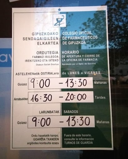Dirección: De Bentaberri Plaza, 2, 20008 Donostia-San Sebastian, Gipuzkoa. Teléfono: 943 21 37 04 Web: https://instagram.com/farmaciaezquerrauriarte%3Figshid%3DMzRlODBiNWFlZA%3D%3D Opiniones: Esta farmacia tiene
